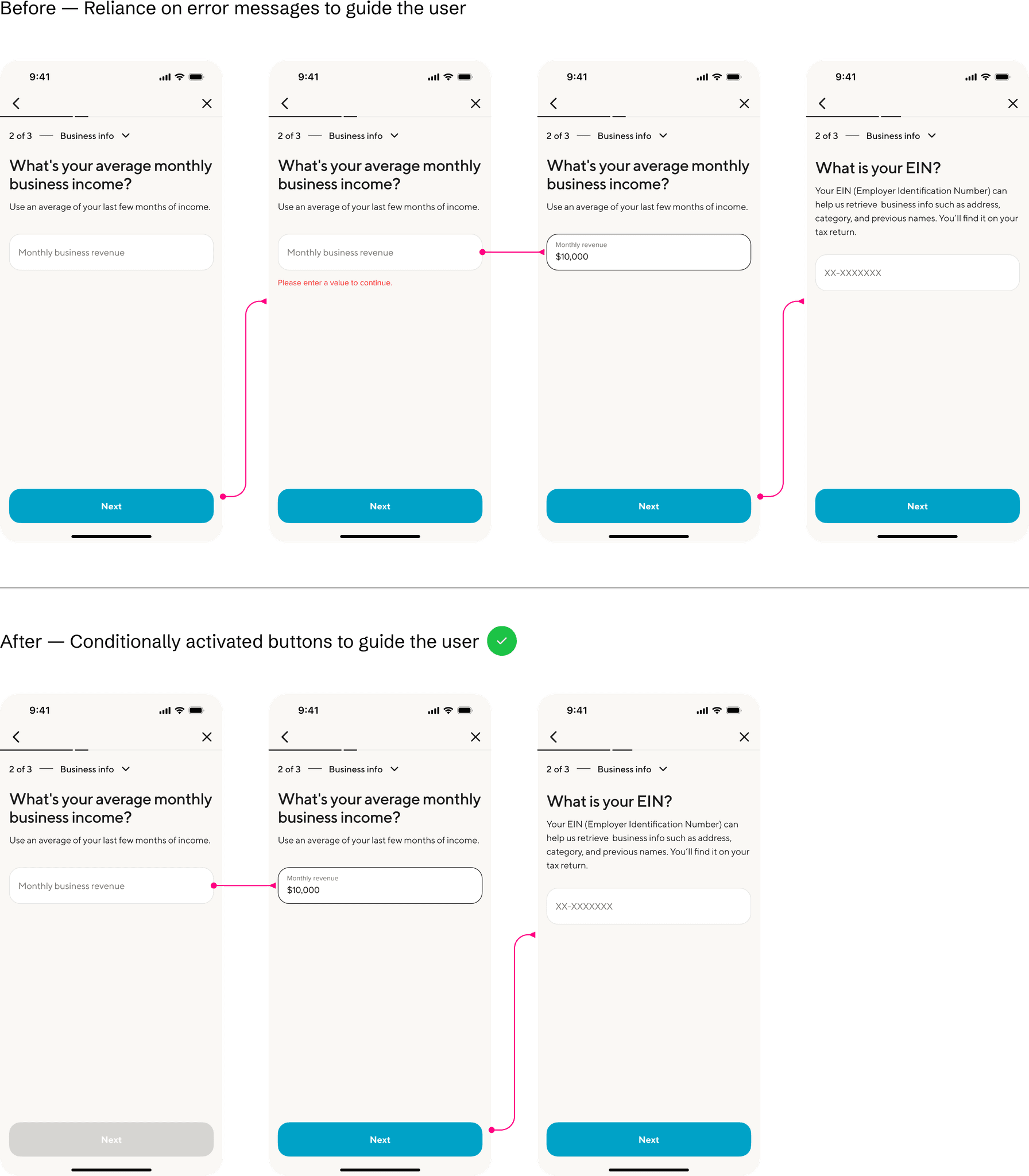 → 25% increase in submission rate of Small Business financing application. Optimizations included a data-validated Q order, smart login experience, and explainer text for each Q.