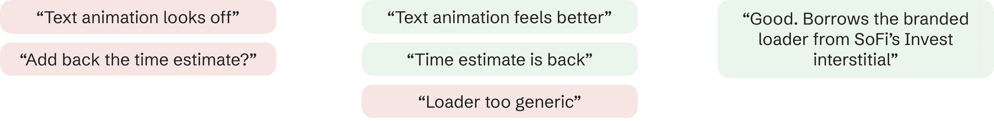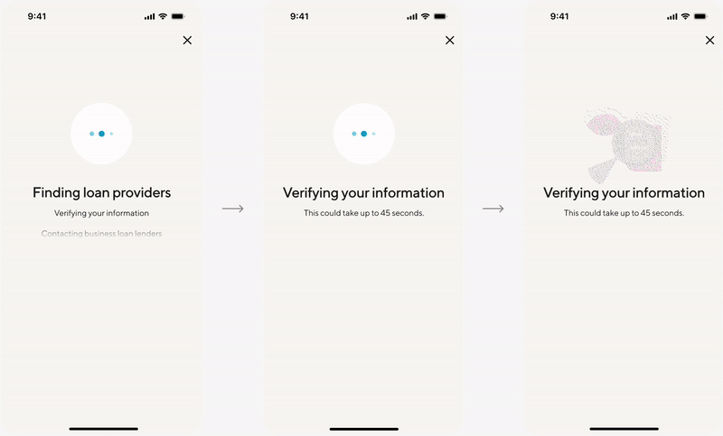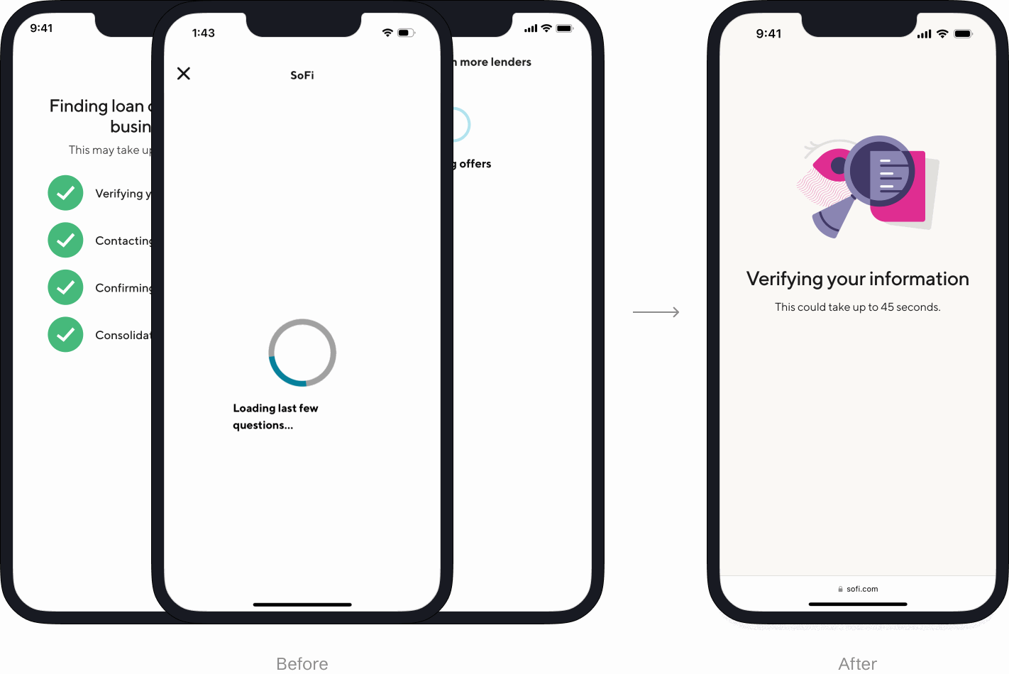 In the hi-fi stage, I sought additional feedback in design critiques and product reviews. The goal of this design was to unify the interstitials (loading screens) for our application funnels.