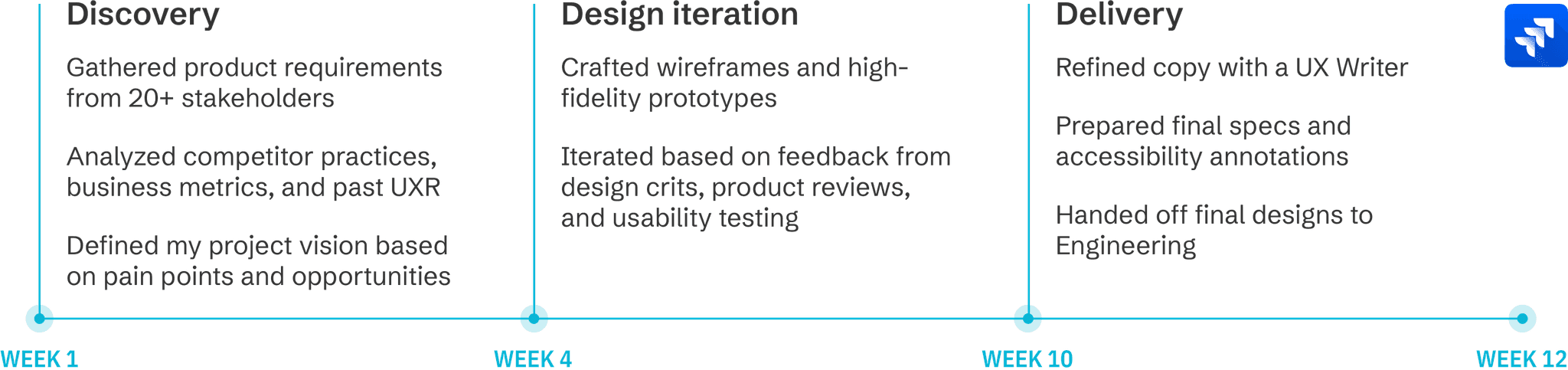 This is how I budgeted my time, from discovery to delivery. I also learned Jira to give teammates visibility into my work.