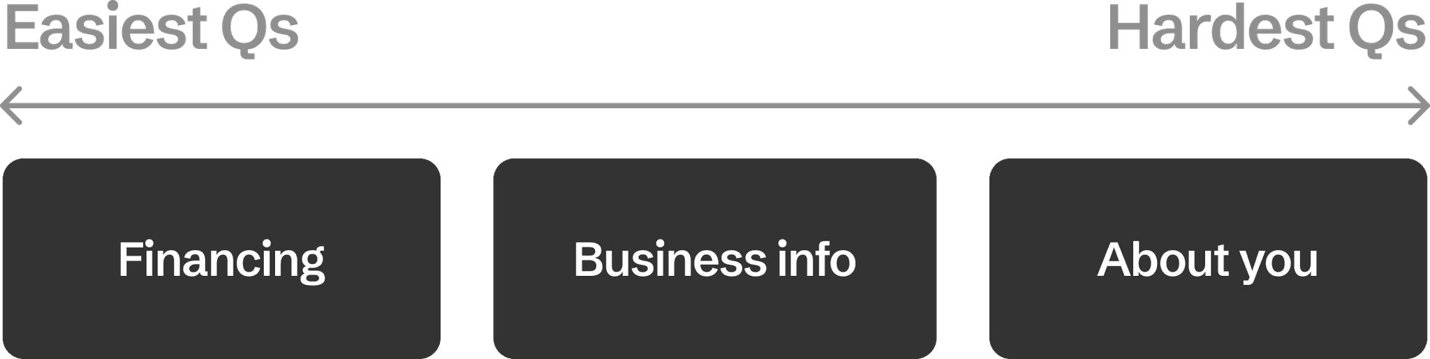 Asks easier questions upfront and harder questions downstream to reduce user friction.